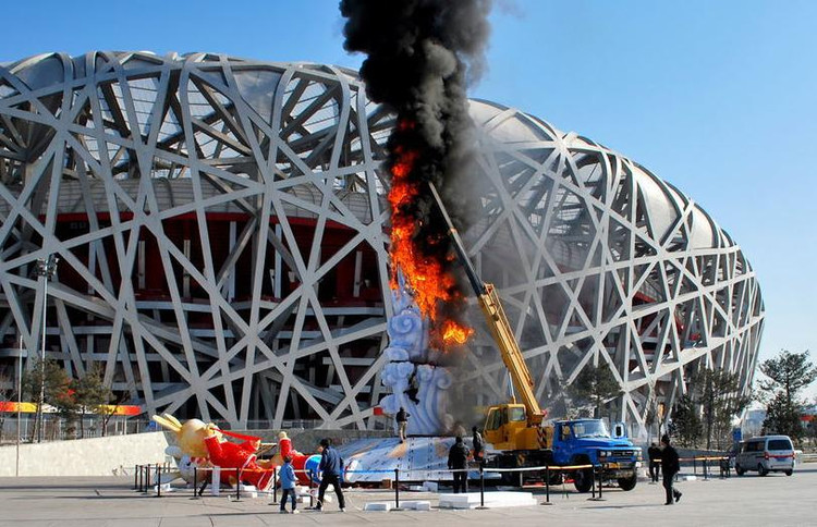2011年1月24日中午12時,鳥巢西側一百米遠處,一處三米高正在施工的“祥云玉兔”裝飾物底部“云彩”部分起火,被工作人員發現后迅速撲滅,濃煙引來近百名游客圍觀。據悉,事因工人施工中電焊引燃塑料泡沫。