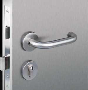防火門專用鎖,包括鎖殼、鎖舌、旋鈕、鎖芯,其特征在于:鎖舌上有轉(zhuǎn)軸連接鎖殼,鎖舌上有撥塊,有一撥桿,撥桿為人字型,撥桿的中部有轉(zhuǎn)軸連接鎖殼,撥桿的頂端與鎖舌上的撥塊對(duì)應(yīng),撥桿中部有一外伸的撥叉,撥桿的后部伸出鎖殼,鎖芯連接偏心桿,偏心桿與撥桿中部的外伸的撥叉相對(duì)應(yīng),旋鈕上連接一偏心桿,偏心桿與撥桿中部相對(duì)應(yīng)能在發(fā)生火災(zāi)等危機(jī)情況時(shí)及時(shí)打開門鎖,而又能用鑰匙、旋鈕鎖定門鎖。