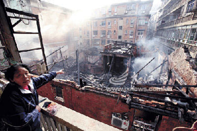 24日一早,筆者趕到事發現場時,現場已被警方警戒,以防止斷壁殘墻傷人。兩層的民房僅剩下四面孤立的磚墻,屋頂全被燒毀,木質的屋梁已燒成焦炭,還不時冒著白煙,幾個從大火中搶出的煤氣罐堆在一旁。消防人員正在收拾裝備,準備離開現場。