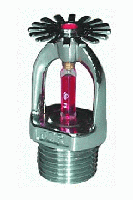 下垂型噴頭是由噴頭框架、溫感元件、密封件、濺水盤等組成,其中噴頭框架是采用銅合金材質(zhì)的精密鍛壓、外表層進(jìn)行鍍鉻拋光的制造工藝,使其具有框架強(qiáng)度高、耐腐蝕性強(qiáng)、外觀精美的特點(diǎn)。溫感元件(玻璃球)具有動作可靠,反應(yīng)速度快。密封件具有抗老化、耐腐蝕、密封性好的性能特點(diǎn)。下垂型噴頭向下噴灑的水量為80%~100%。玻璃球的直徑為5mm[RTI 大于50(m·s)0.5且小于等于80(m·s)0.5]。依據(jù)玻璃球動作的溫度不同而分為多種溫級噴頭。