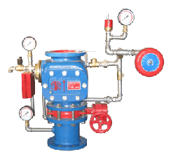雨淋報警閥主要結構為閥體、閥瓣、閥座、隔膜控制室及壓桿等。屬杠桿式控制閥。閥體材料為灰口鑄鐵,閥瓣、閥座、膜室蓋、控制室支持架均采用銅合金材料,壓桿軸、閥瓣軸及彈簧等采用不銹鋼材料,密封墊、控制室隔膜采用丁腈橡膠。閥瓣打開后,壓桿在彈簧作用下旋轉一定角度支住閥瓣,使其不能關閉。滅火后,可用扳手在閥體外側旋轉復位,無需打開閥體蓋進行復位。